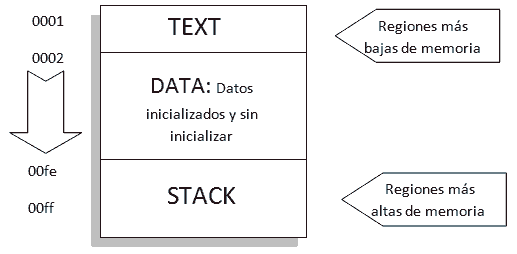 Para entender cómo funcionan los Stack Overflow deberemos entender primero cómo es organizado un proceso en memoria. Los procesos son divididos en tres regiones: TEXT, DATA, y STACK. Nos centraremos en región de STACK o más conocida como pila. Pero no seamos perezosos, primero veamos una pequeña vista de las otras regiones.