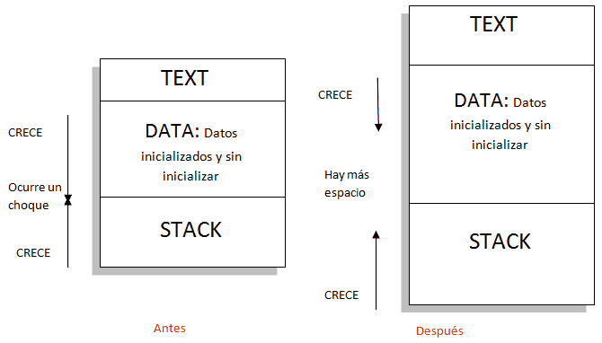 La región contiene datos inicializados y sin inicializar. Las variables estáticas (static: su valor perdura durante la ejecución de todo el programa) son guardadas aquí. La región DATA corresponde a la sección data-bss de los ejecutables. Su tamaño es agrandable con la instrucción de código C: system call brk(2) y, si el crecimiento de éste o del STACK agota la memoria disponible, el proceso es repaginado para ejecutarse otra vez, pero con un espacio de memoria mayor (como se muestra en la figura). Quiere decir que esta vez hay más memoria entre los segmentos DATA y STACK para que éstos puedan seguir creciendo (El segmento DATA crece hacia abajo y el STACK hacia arriba).