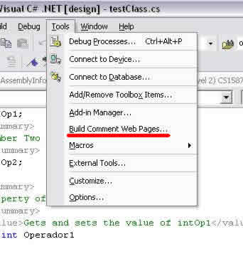 Para utilizar esta herramienta en VS 2003 apuntamos al menú de Herramientas (Tools), y seleccionamos la opción Generar Reporte Web de Comentarios (Build Comment Web Pages), tal como se muestra en la siguiente figura: