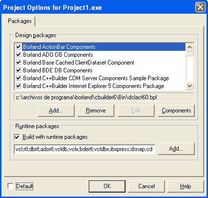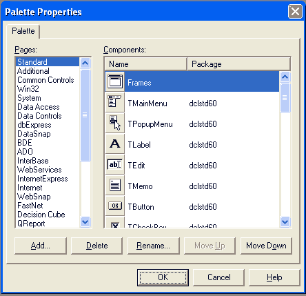 Si usted programa en C++ Builder sabrá lo que es la VCL del Builder, y las facilidades que ésta permite -a diferencia del Visual C++ de la Microsoft- para desarrollar aplicaciones visuales creando los formularios y agregando componentes y controles visuales en tiempo de ejecución. Estas funciones y controles visuales de la VCL están contenidos en paquetes, lo cual se puede chequear. Por ejemplo, seleccione con la vista una página de la paleta de componentes visuales y observe los controles que posee. Ahora vaya a Component » Configure Palette… y verá como aparecerán las paletas con sus controles y, al lado de los controles que están en Components, aparecerá el nombre del paquete a que pertenecen. Usted verá algo cómo esto: