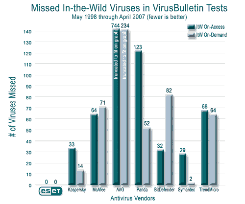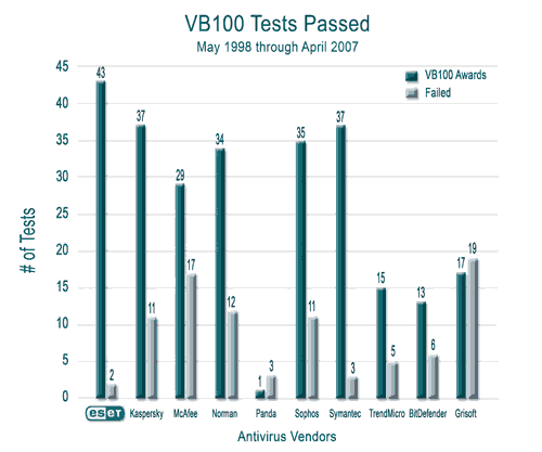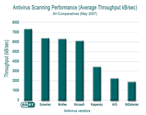 NOD32 lleva una gran ventaja frente a otros productos antivirus (según Virus Bolletin, su eficacia es del 100%). En comparación con otros productos antivirus, su bajo consumo de recursos lo hace mucho más rápido que cualquier programa de la competencia y sus análisis antivirus son muy rápidos.