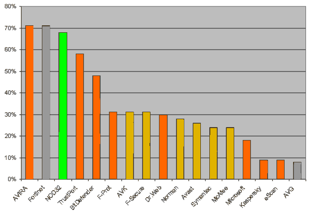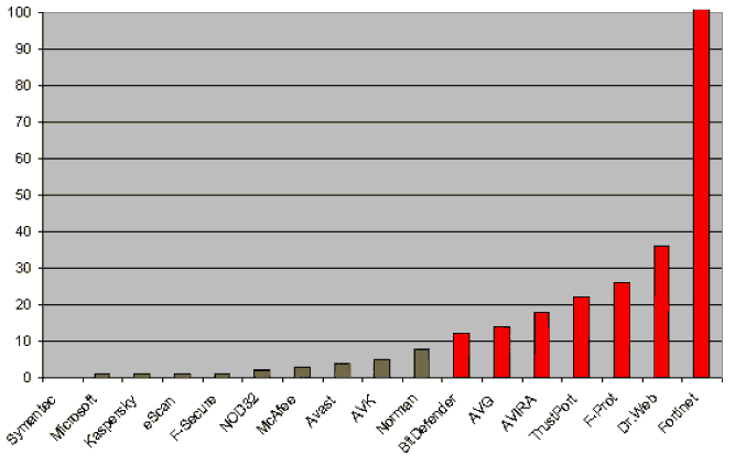 A continuación se muestran dos resultados estadísticos de principios del mes de junio del 2007, realizados por AV-Comparatives, donde se muestra el porciento de nuevos virus detectados en relación al total introducido y la cantidad de «falsos positivos» ocurridos, respectivamente.