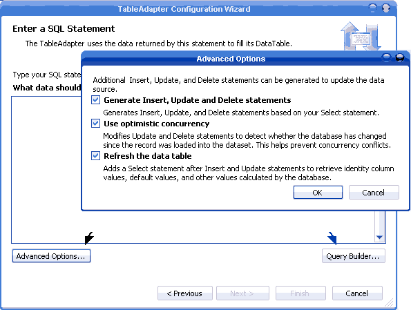 SELECT * FROM TABLA_X;. Es importante incluir los campos llaves de la tabla si queremos poder actualizar los datos de la base de datos cuando los modifiquemos en tiempo de ejecución. - El próximo paso, ya casi al terminar, es especificar los métodos que queremos que tenga nuestro TableAdapter. Incluya ambos: