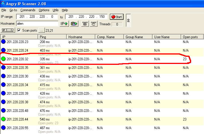 Es difícil saber cual de las tanta maquinas que están conectadas a la red esta encendida, por eso, lo mejor es hacernos ping a nosotros mismos primero, para saber cual es nuestra dirección IP, luego usar el ipscan para scanear la red en busca de algún PC, es recomendable, para ahorrarnos trabajo, marcar los puertos por los que pretendamos entrar. Supongamos que exista una maquina con IP 201.220.220.32 y que además tenga el puerto 23 abierto.