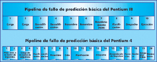 La tecnología hipercanalizada duplica la profundidad de canalización (pipeline) de la microarquitectura P6 del procesador Pentium® III a 20 etapas, y aumenta la predicción de saltos.